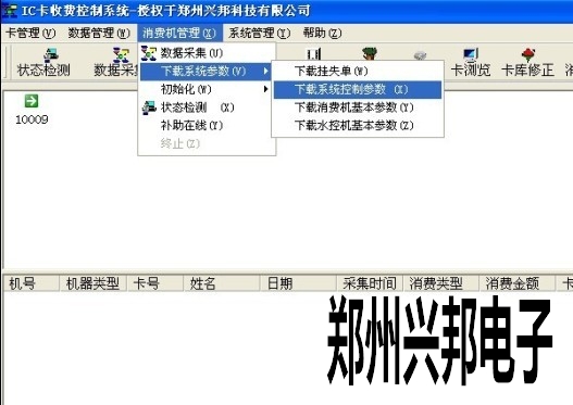 具體操作步驟為:將消費機連接到通訊線上,打開一卡通系統(tǒng)確認機器通訊正常然后選擇--消費機管理--下載系統(tǒng)參數(shù)--下載系統(tǒng)控制參數(shù)--下載消費機基本參數(shù)或者下載水控機基本參數(shù)(如下圖所示)