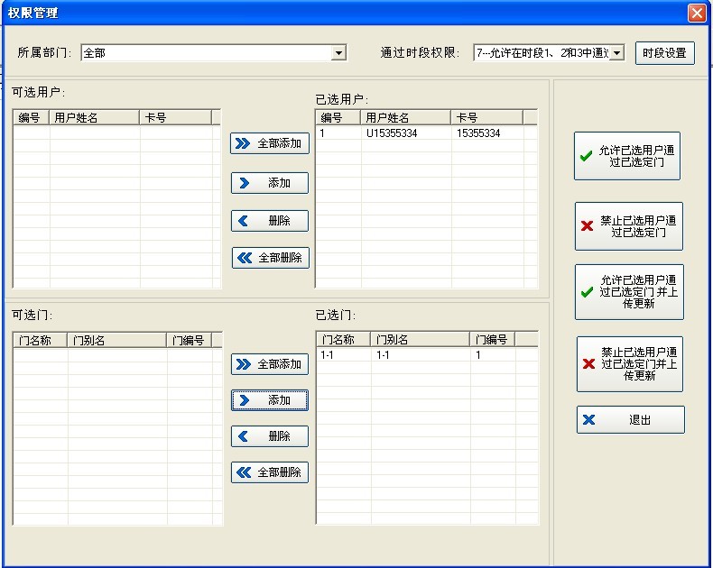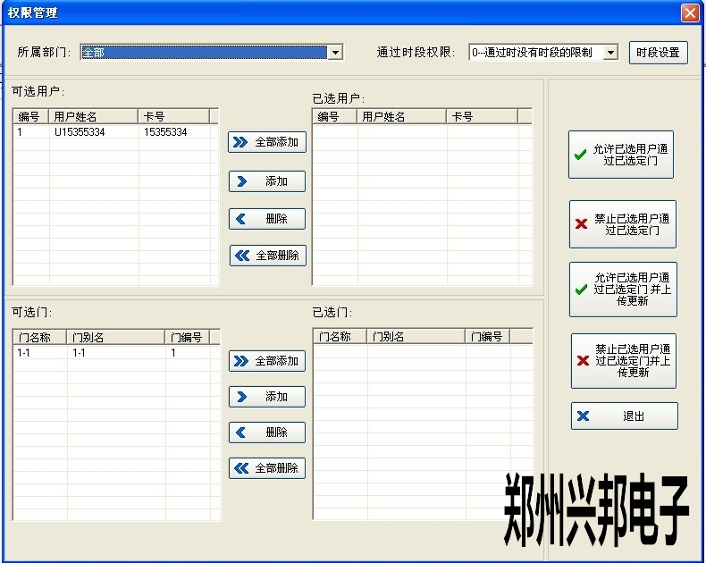 4、上傳完成后關(guān)閉窗口,在‘通過時間段權(quán)限’中選擇需要的時間段然后將用戶和控制器都添加進去,最后點擊‘允許已選用戶通過已選定門并上傳更新’上傳權(quán)限。如下圖所示