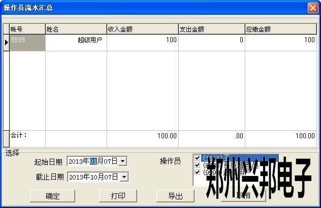4.查詢操作員賬戶匯總是在操作員流水匯總表中,可根據(jù)日期查詢到收入、支出及應(yīng)繳的金額。
