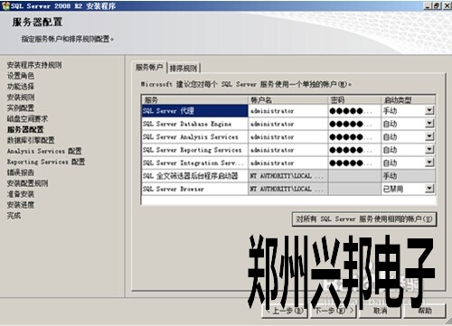 在這里,首先要配置服務器的服務帳戶,也就是讓操作系統(tǒng)用哪個帳戶啟動相應的服務。 為了省事,我們選擇“對所有SQL Server服務使用相同的帳戶”。也可以選擇,NT AUTHORITY\SYSTEM,用最高權限來運行服務。接著,還要設備排序規(guī)則,默認是不區(qū)分大小寫的按你的要求自行調(diào)整。