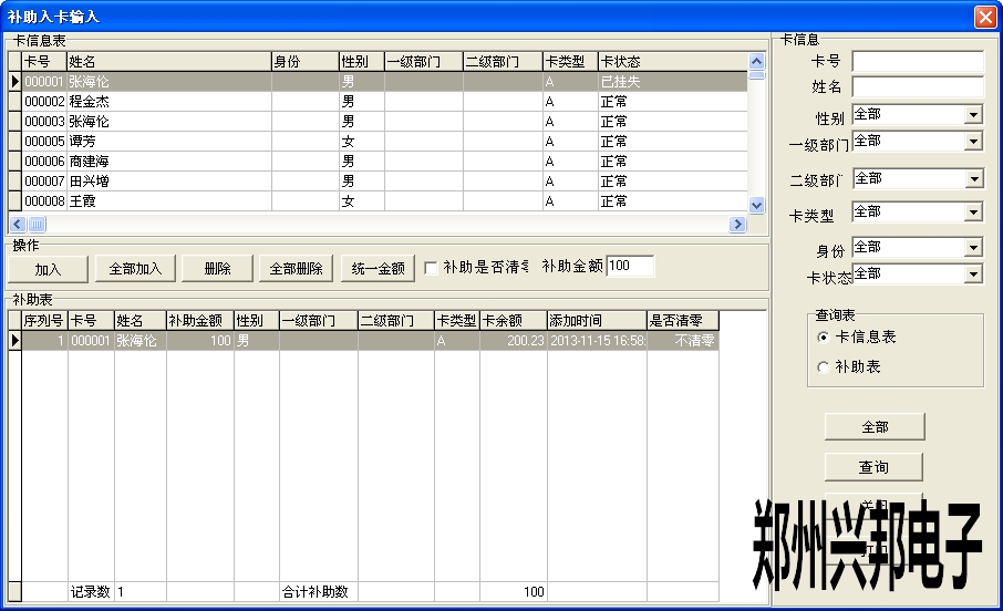軟件中卡管理-補(bǔ)助入卡-補(bǔ)助入卡輸入中添加補(bǔ)助人員的名單,可以選擇是否清零,若選擇補(bǔ)助清零,在領(lǐng)取補(bǔ)助時(shí)會(huì)將卡上的金額先清零再補(bǔ)助上此次的金額;若選擇不清零,則在領(lǐng)取補(bǔ)助時(shí)會(huì)累加之前卡上的金額。