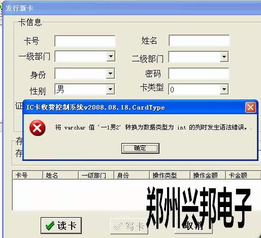 客戶使用的是我們的局域網(wǎng)一卡通食堂售飯機(jī),在使用我們軟件時(shí),新卡無法發(fā)行,在發(fā)行新卡的時(shí)候出現(xiàn)了將varchar值‘一1男2’轉(zhuǎn)換為數(shù)據(jù)類型為int的列時(shí)發(fā)生語法錯(cuò)誤。