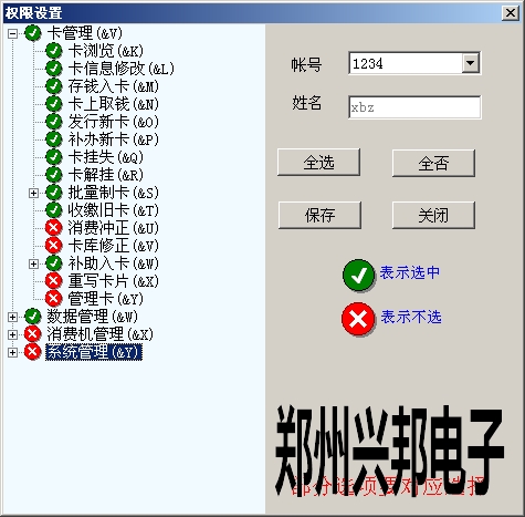 出納員要操作卡片的充值、掛失等操作,所以要分配卡管理的權(quán)限,其他的權(quán)限不予分配