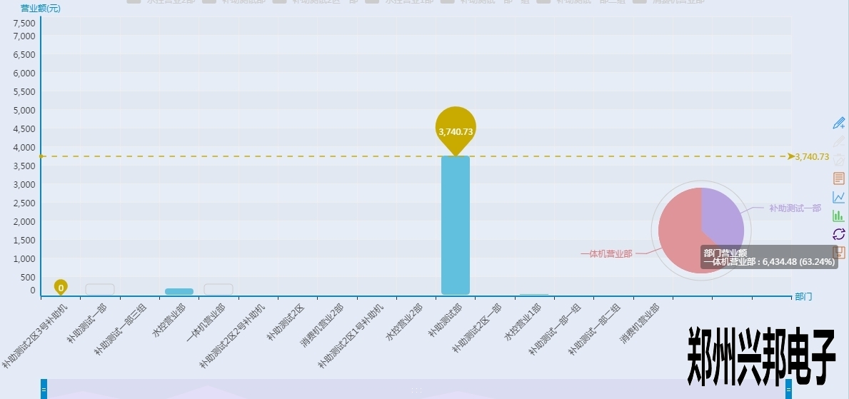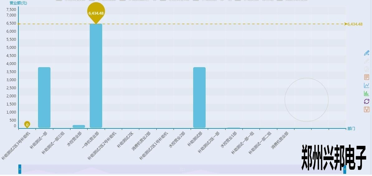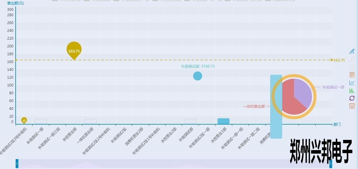 看上起跟終端營(yíng)業(yè)圖表差不多,但是有沒(méi)有注意到有一根和終端營(yíng)業(yè)分析圖不一樣樣色的虛線?這是這個(gè)圖表里面的最大值,也就是營(yíng)業(yè)額最高的部門(mén),當(dāng)然下面的工具條也可以像終端營(yíng)業(yè)分析圖一樣的滑動(dòng)來(lái)看某個(gè)具體的柱圖,不過(guò)你又沒(méi)有注意到后面還有一個(gè)圈?對(duì)那是一個(gè)圈圈,有什么用呢?來(lái)看一下下面的圖形: