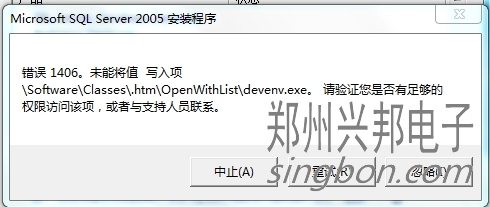 客戶使用我們的互聯(lián)網(wǎng)一卡通食堂售飯機(jī),自己安裝SQL2005數(shù)據(jù)庫沒裝成功,讓我們遠(yuǎn)程再重裝一次,在控制面板里卸載后并刪除之前的安裝文件,又重新安裝時提示:錯誤1406。未能將值 寫入項\Software\Classes\.htm\OpenWithList\devenv.exe。請驗證您是否有足夠的權(quán)限訪問該項,或者與支持人員聯(lián)系。這時該怎樣解決呢?