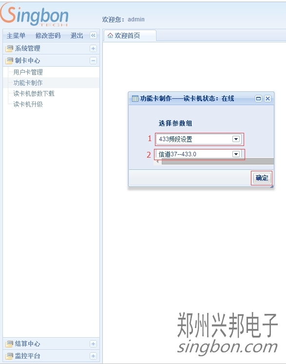 在上圖中,方框1處參數(shù)組選擇“433頻段設(shè)置”,方框2處是供用戶選擇的信道,用戶選擇好需要使用的信道后,在綁定的讀卡機(jī)上放一張相同參數(shù)未發(fā)行的卡片,點(diǎn)擊“確定”按鈕后功能卡制作成功。用制作好的功能卡在機(jī)器的刷卡處刷卡,從而修改機(jī)器的信道。